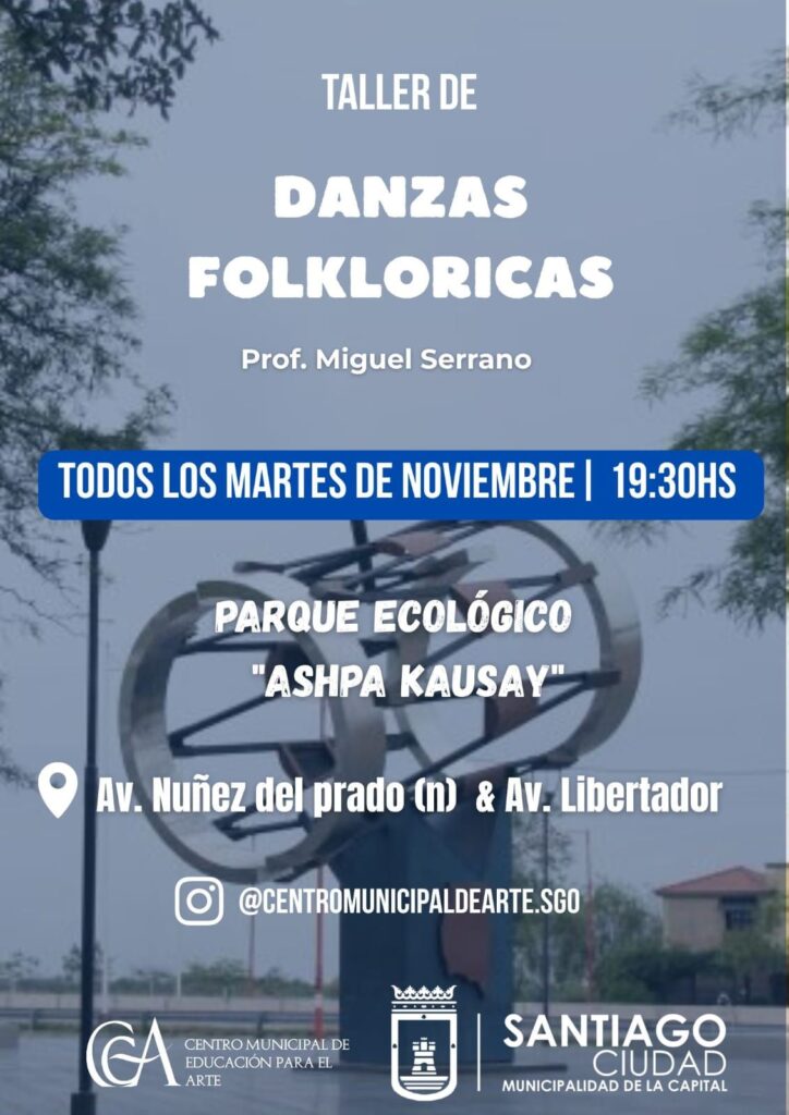 El Centro de Educación para el Arte (CEA) de la Municipalidad de la Capital informa que este martes 4 de noviembre a las 19:30 horas comenzará un Taller de Danzas Folclóricas en el Parque Ecológico “Ashpa Kausay” ubicado en Av. Núñez del Prado y Av. Libertador.