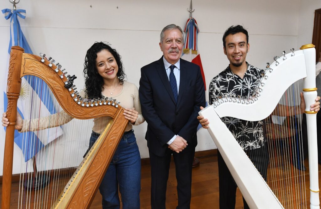 El jefe de Gabinete, Elías Suárez, recibió este jueves por la mañana en Casa de Gobierno a artistas que participarán del 21° Encuentro Latinoamericano Mishquila de Arpas, que se realizará del 20 al 23 de agosto con conciertos en el Centro de Convenciones Fórum y en el Teatro 25 de Mayo.