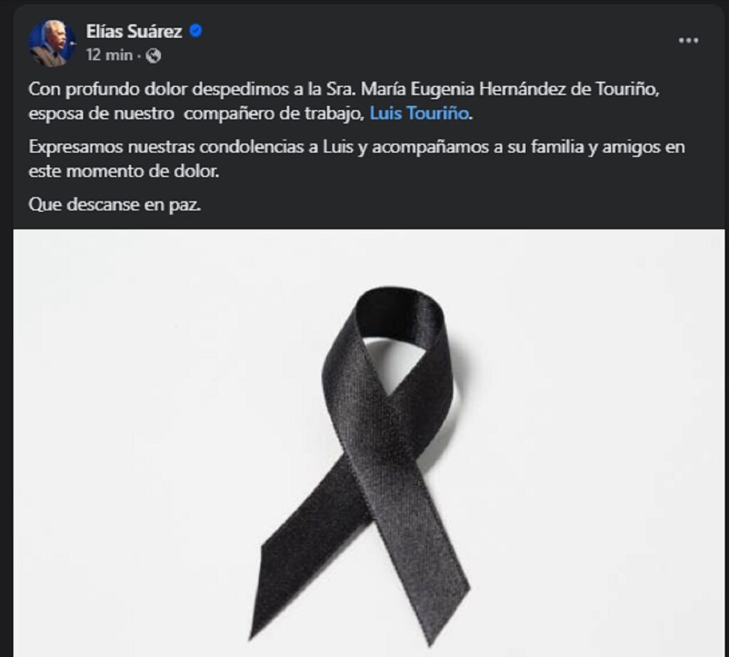 “Con profundo dolor despedimos a la Sra. María Eugenia Hernández de Touriño, esposa de nuestro compañero de trabajo, Luis Touriño. Expresamos nuestras condolencias a Luis y acompañamos a su familia y amigos en este momento de dolor. Que descanse en paz”, escribió el mandatario provincial.