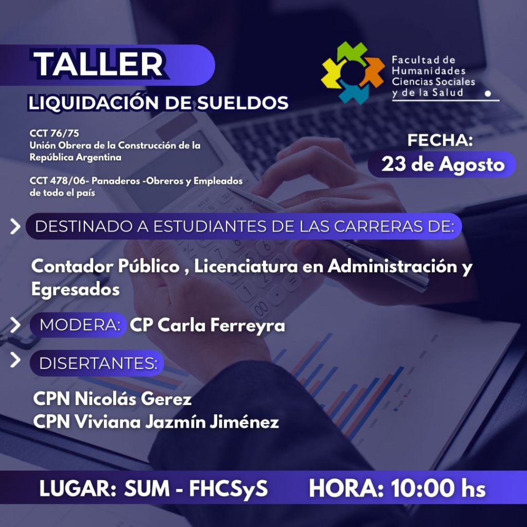 La Facultad de Humanidades, Ciencias Sociales y de la Salud (FHCSyS) llevará a cabo una nueva edición del Taller de Liquidación de Sueldos, una propuesta de capacitación destinada a estudiantes y egresados de las carreras de Contador Público y Licenciatura en Administración.