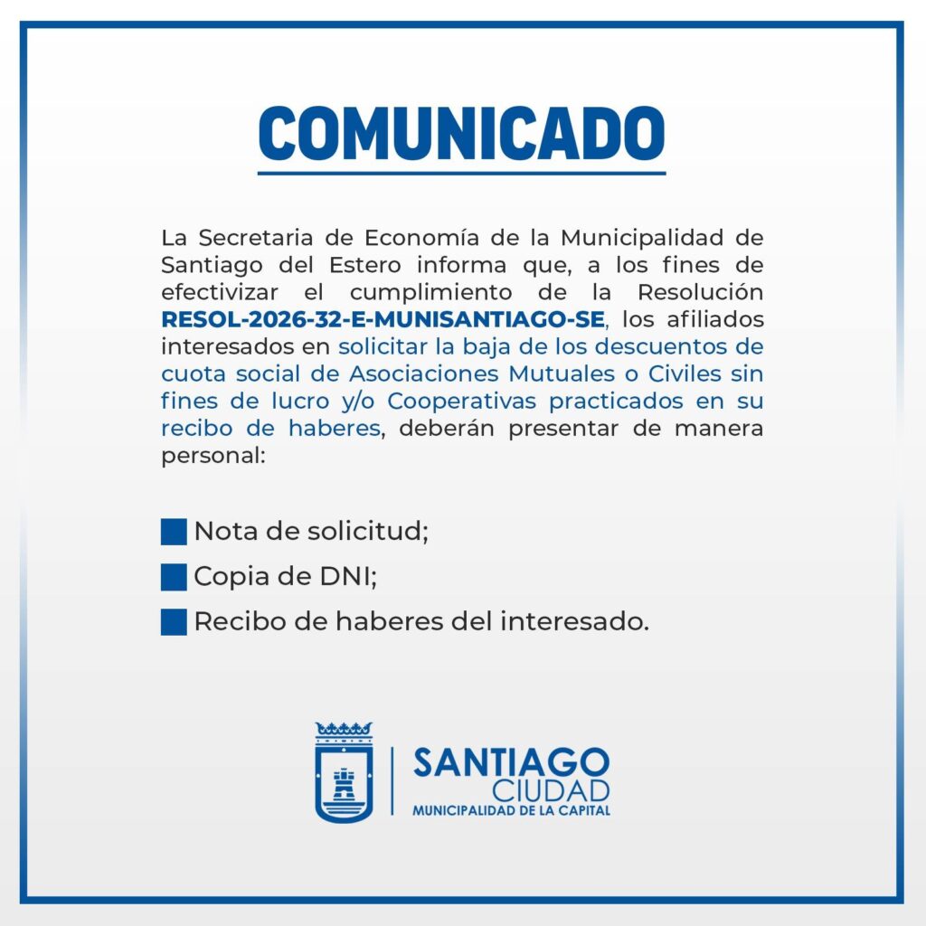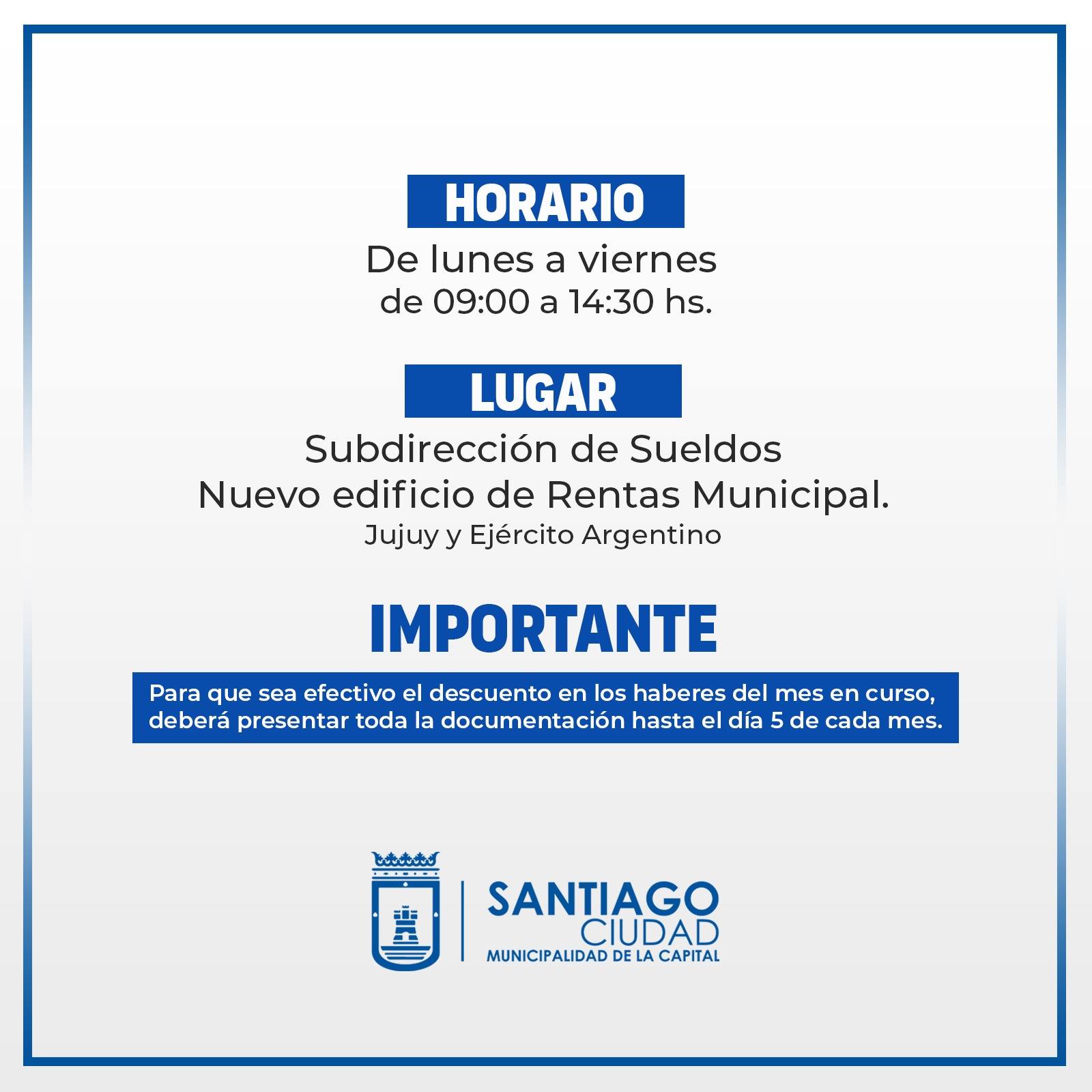 Por ese motivo, a través de la RESOL-2026-32-E-MUNISANTIAGO-SE, el área de Economía comunicó que los empleados que así lo requieran, deberán presentar de manera personal: una nota de solicitud, copia del DNI y recibo de haberes del interesado.