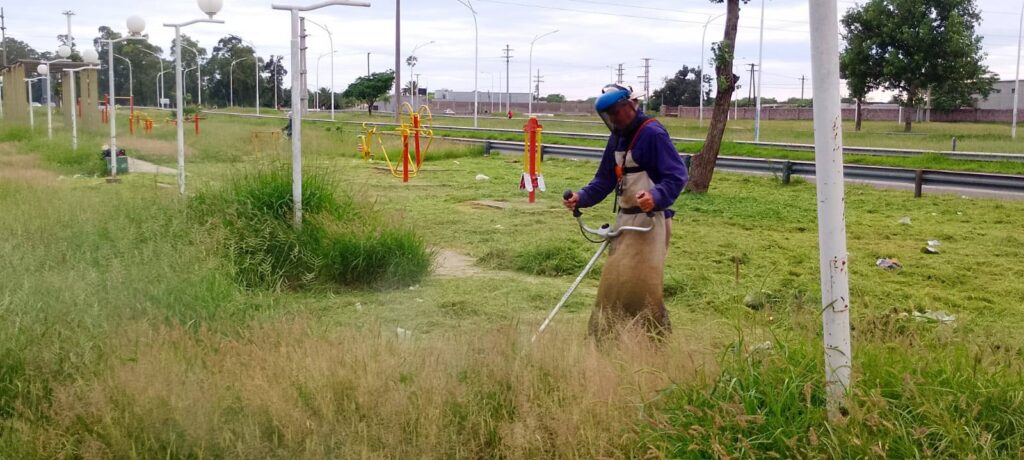 Personal del obrador Misky Mayu se encuentra realizando tareas de desmalezamiento en la plaza saludable del barrio 1° de Mayo, con el objetivo de mantener los espacios públicos limpios, seguros y en condiciones para el disfrute de los vecinos.