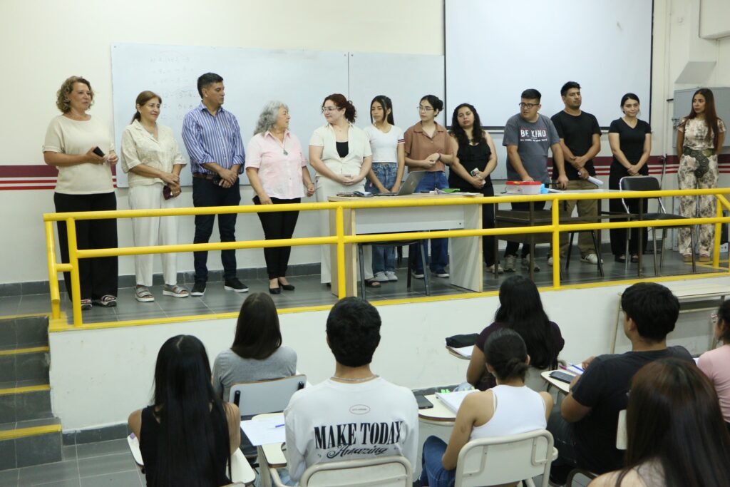 Acompañaron la visita: Dra. Sandra Martínez, Secretaria Académica de la FAyA; Lic. Cristián Navarro, Secretario de Extensión, Vinculación y Transferencia; Srta. Verónica Lobo, Presidenta del Centro de Estudiantes (CEFAyA); Tutores Pares e integrantes del Sistema Institucional de Tutorías; Estudiantes de diversas carreras miembros del CEFAyA.