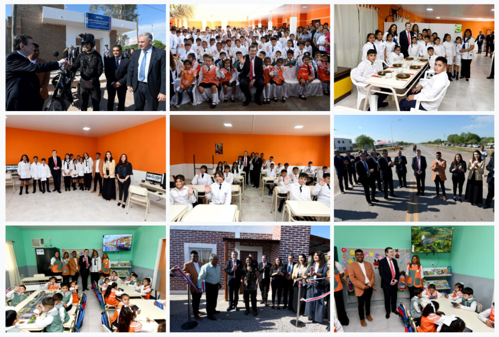 El recorrido continuó por la obra de pavimentación en la ruta 2, para luego dejar inaugurada la renovación total de edificios educativos donde las autoridades provinciales fueron recibidas por la directora María Elena Vizgarra, quien tras el corte de cintas y descubrimiento de placa acompañó en la visita a ambos establecimientos que cuentan con conexión de internet de banda ancha y fueron equipados con mobiliario, material didáctico y herramientas tecnológicas para el desarrollo del aprendizaje de los 266 chicos que asisten a la primaria y de los 61 alumnos del Nivel Inicial.