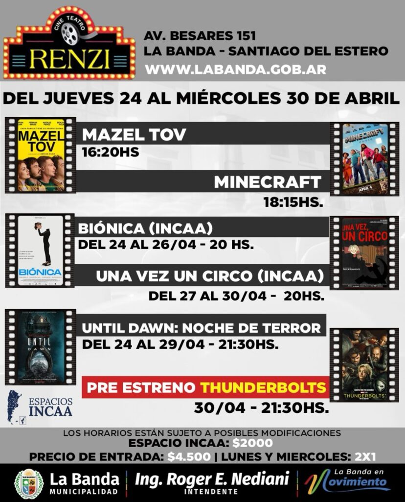 La Municipalidad de La Banda informa que el Cine Teatro Renzi presenta una nueva programación con una variada propuesta cinematográfica para todos los gustos, desde el miércoles 24 hasta el martes 29 de abril.